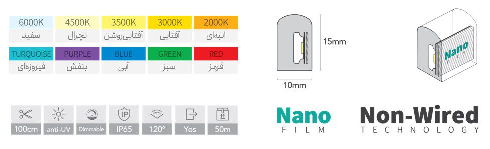 آبی (BLUE), آفتابی (3000k), آفتابی روشن (3500k), انبهای (2000k), بنفش (PURPLE), سبز (GREEN), سفید (6000k), فیروزه ای (TURQUOISE), قرمز (RED), نچرال (4500k)